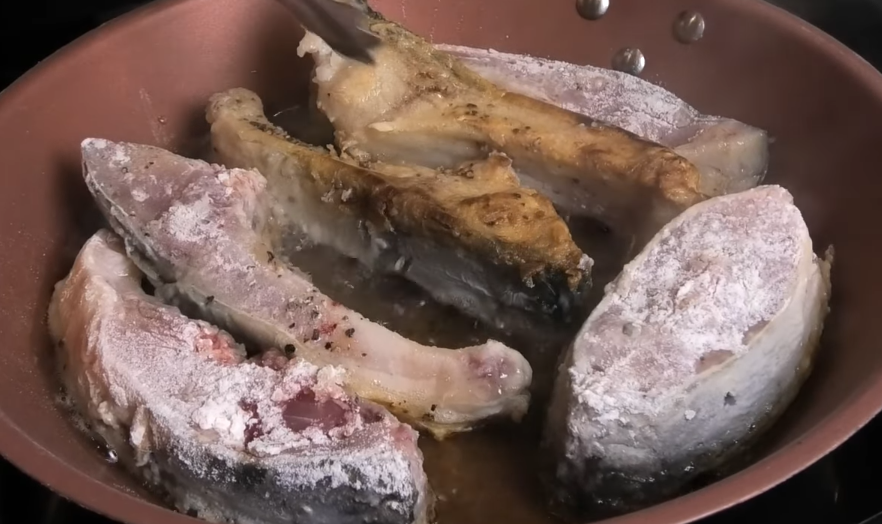 На крупной рыбе, такой как у меня, кости всё равно толстые, и выбрать их практически невозможно. Поэтому я не использую этот метод. Большие куски рыбы я разрезаю пополам, чтобы было удобно жарить и есть. Если у вас маленький карп, то обязательно нужно делать частые надрезы вдоль спины.