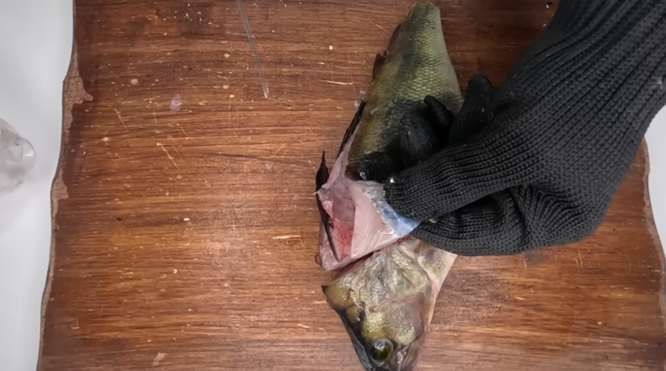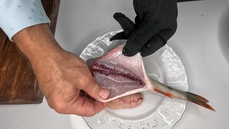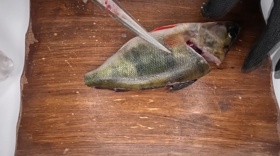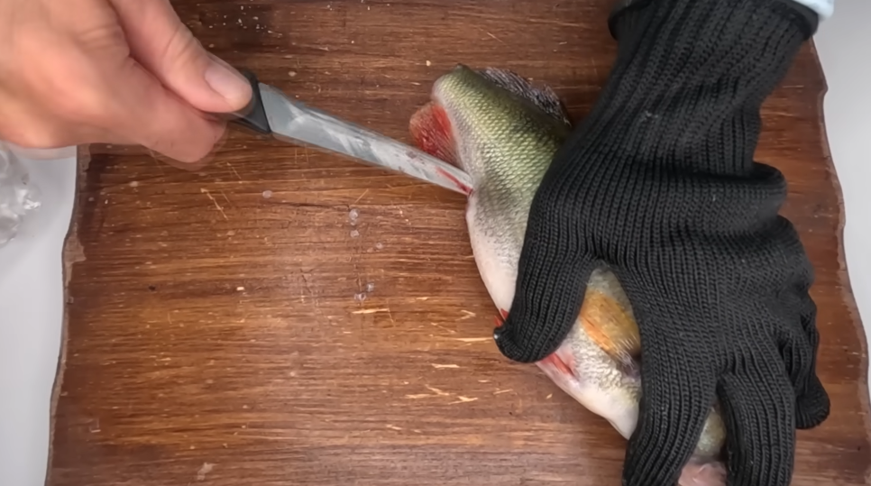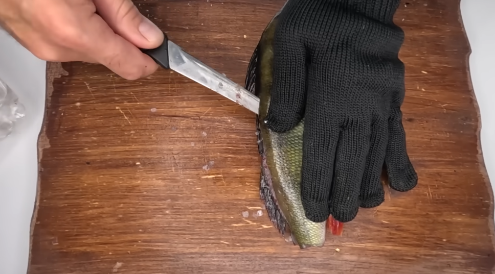 Запах речной и озёрной рыбы в этом способе немного остаётся в окуне, и чистить окуня не надо, достаём ножик и делаем всё просто, отрезаем голову и потрошим окуня.Надо сказать, что сейчас уже окуни все идут с икрой, поэтому я потрошу аккуратненько, чтобы не повредить икру. Одевайте любую перчатку на одну руку, жаберные крышки у окуня как игла, вернее, как бритва, она вообще моментально режет руку, и вы увидите, что большой палец, которым будете держать голову, он у вас будет весь порезанный, может, до крови и не разрежет, но приятного будет мало, поэтому перчатка при чистке окуня обязательна.