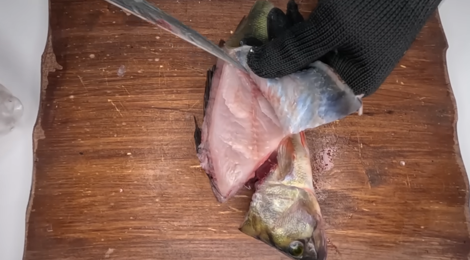 Теперь берем окуня одной рукой за голову другой за тушку и отделяем филе окуня от чешуи и шкуры. Филейку и икру хорошенько моем и не забываем убрать с ребер окуня белую пленку она дает горечь.