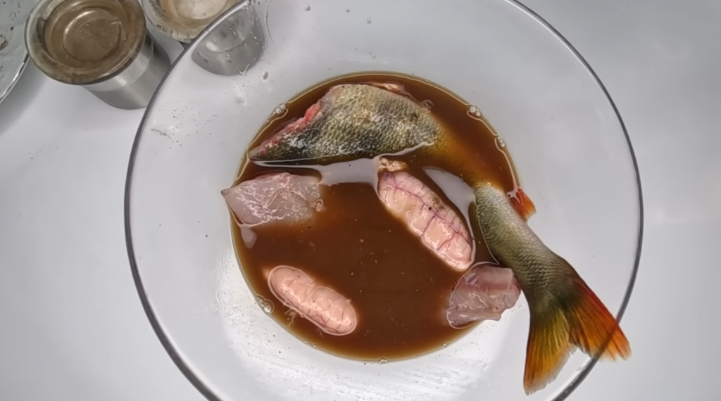 На моих два окуня я кладу где-то ложечки полторы-две горчицы, потом доливаю сюда же соевого соуса, можно добавить ещё немножко подсолнечного масла, кто любит пожирнее, и еще нам понадобится грамм 100 кипяченой воды, теперь все тщательно перемешиваем и опускаем в соус окуней ориентировочно минут на 40, можно конечно и дольше, хуже от этого не будет.