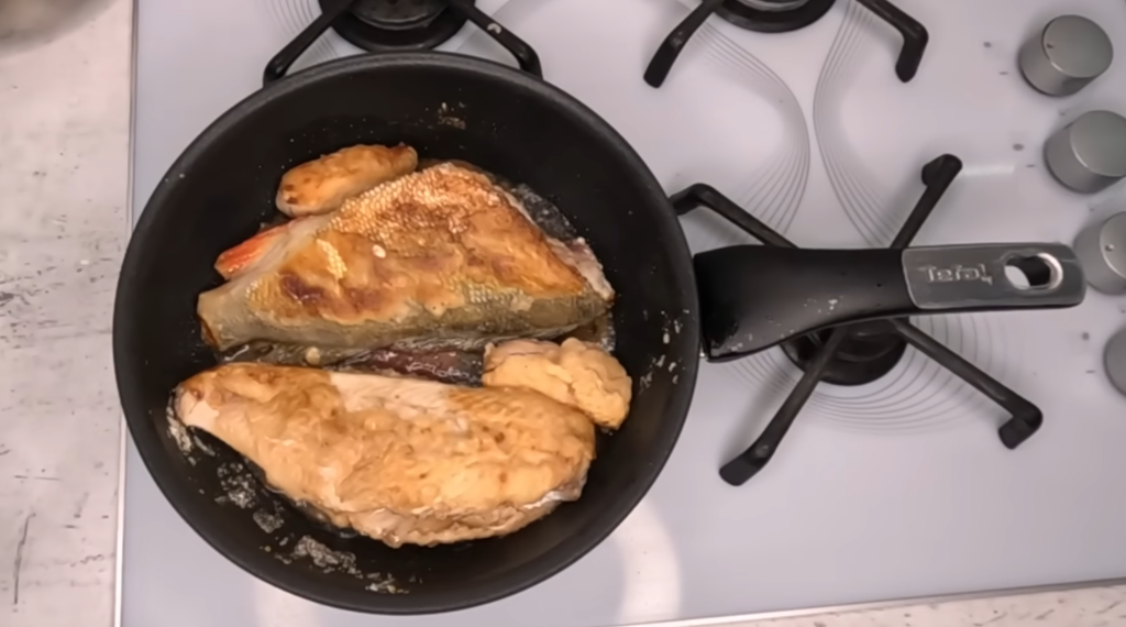 Хотел бы пару слов сказать буквально. Икра, конечно, пожарится быстро, а вот такой окунь с чешуей, он довольно большой, он пожарится минут за 20, и желательно пару раз его перевернуть, потому что довольно толстый слой. Тушка окуня прожарится, конечно, быстрее, но окунь в чешуе получается вкусней, он сочней, но готовится дольше.