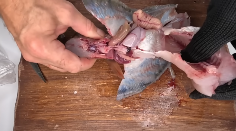 Следующим этапом отрезаю голову, перерезаю хребет, но не до конца.