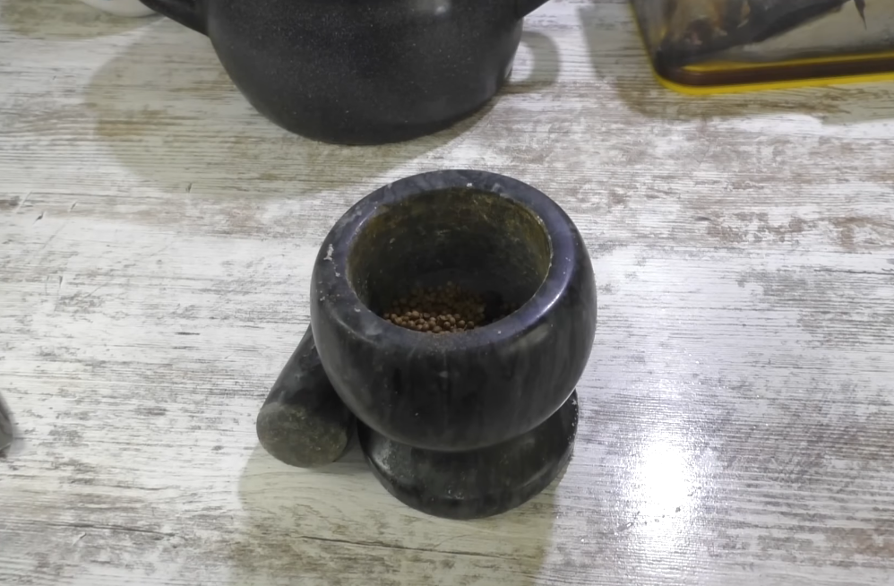 По сухим специям, которые мы закинули в таком виде целом, их нужно раздавить, я вообще не вижу смысла, когда кидают целиком, которые горошком, в не раздавленном виде вы от них не получите практически половины того вкуса, который они могут вам дать, обязательно нужно размять не в пыль, а просто раздавить, тогда они будут максимально отдавать свой аромат и вкус маринаду, ну и вообще когда готовить.