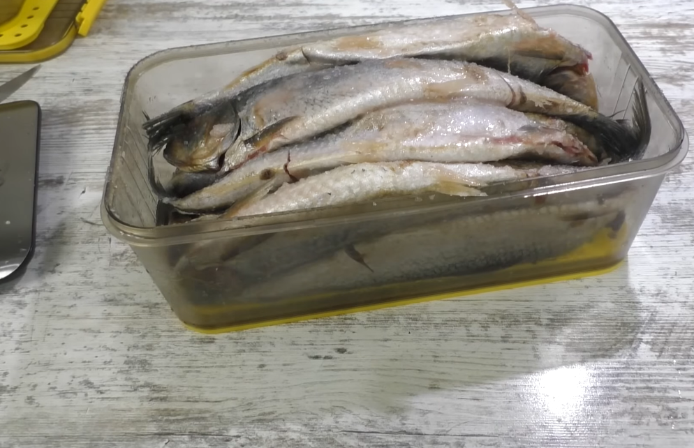 Ну что, друзья, двое суток прошло, селёдка просолилась, смотрите, вся соль с поверхности впиталась в неё, она подсохла, и вся жижа стекла на дно контейнера.