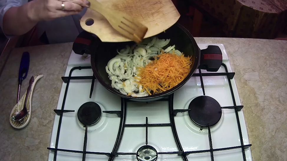 Сковородка разогрелась, отправляю лук. Теперь морковку, морковку натираю на крупной терке, наверное, где-то половину большой морковки будет достаточно.