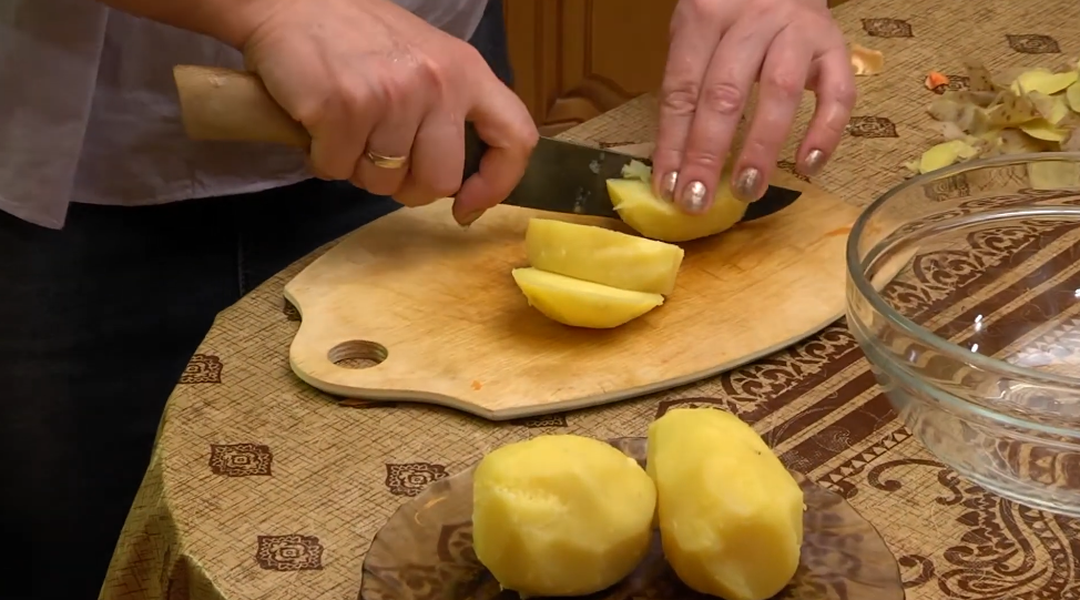 Картошку я почистила, порежу ее на кубики, мельчить тоже не надо. Пока я нарезаю картофель, овощи на сковороде дойдут, и чтоб картофель при нарезке не сливался, ножик можно периодически смачивать в холодной воде.