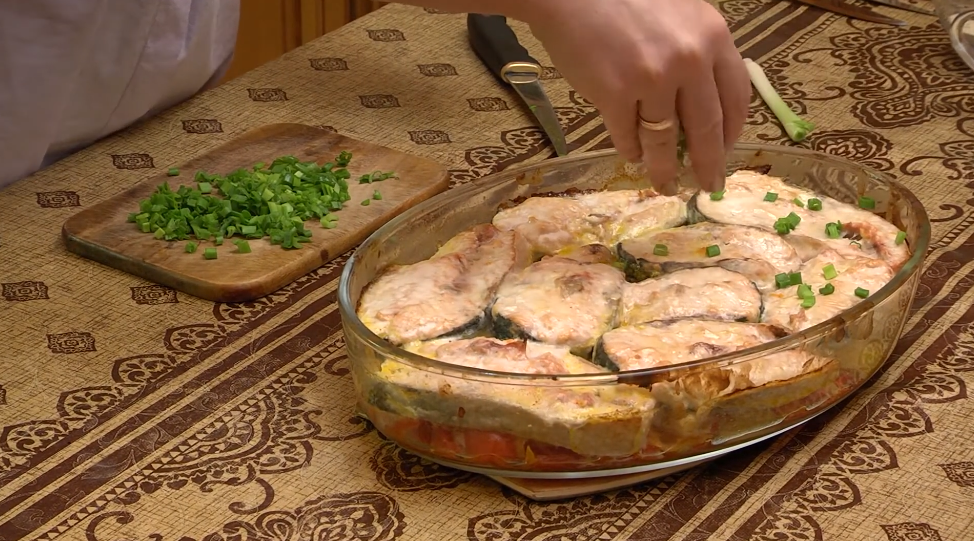 Время приготовления уже вышло, я выключаю духовку, почти 30 минут она у нас здесь запекалась, и достаем нашу форму, овощи дали жидкость. Можно украсить зеленым луком, можно укроп порезать, можно петрушку мелко порезать, чтобы как-то красиво у нас все это выглядело.