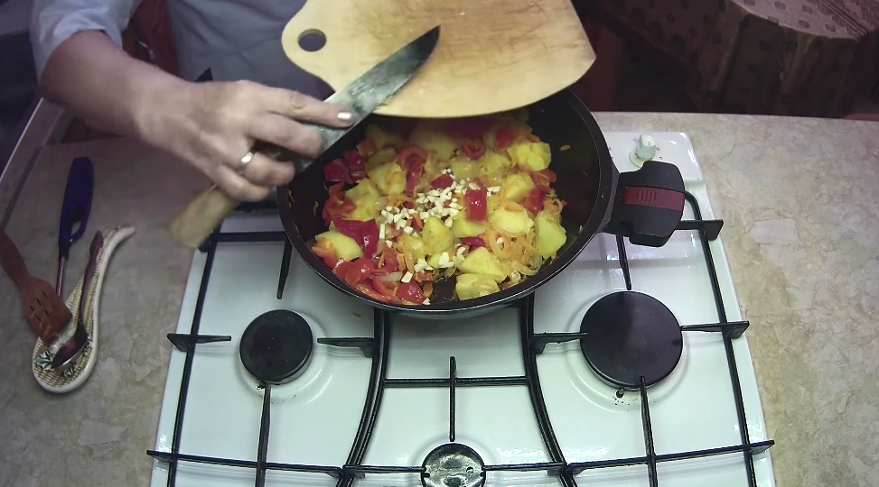 Чеснок я тоже порежу на мелкие кусочки, чеснокодавилку здесь использовать не буду, отправляю в жаровню, еще раз всё перемешиваю и выключаю.