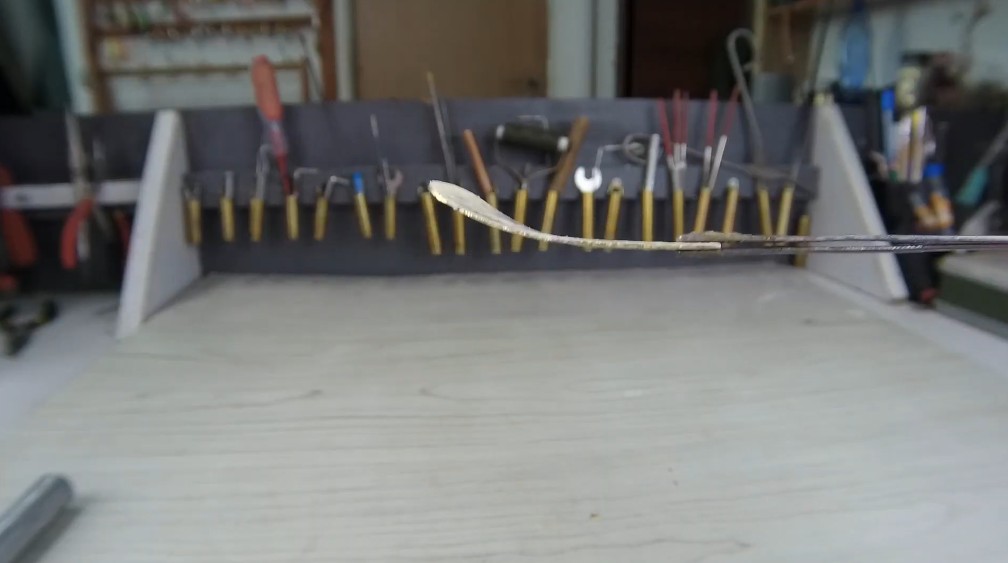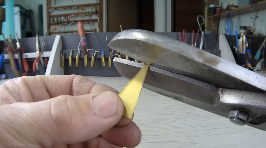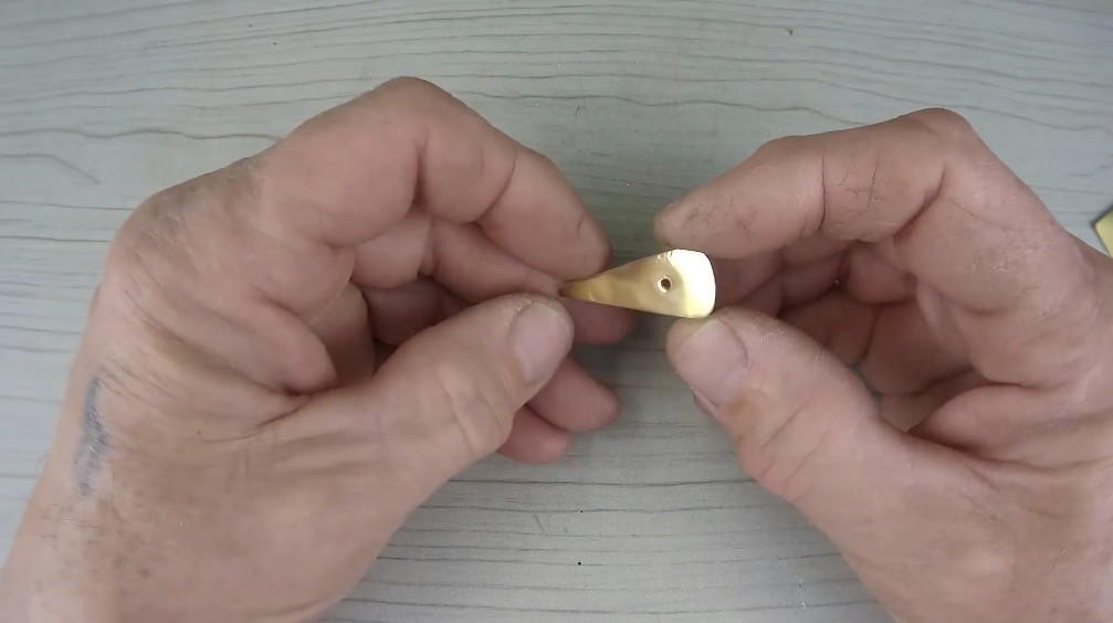 Отступив от широкого кроя 10–12 мм, по центру сверлим отверстие диаметром 0,5 мм, это для крепления петли. Если заготовка из цветного металла, я сразу придаю ей окончательный вид, можно просто пройти мелкой наждачной бумагой или отполировать её.