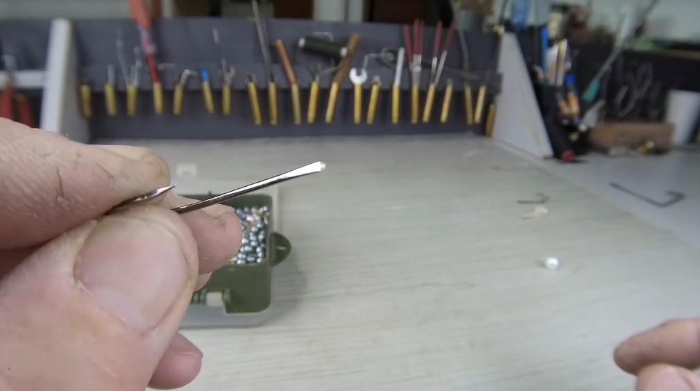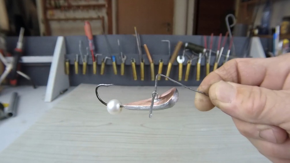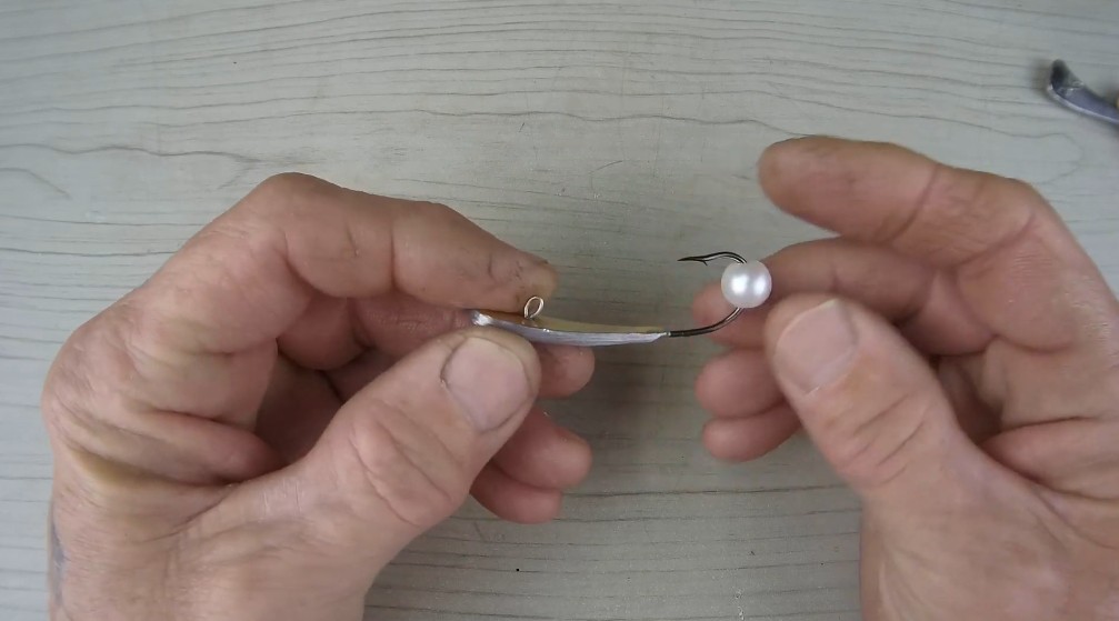 Теперь нужно подобрать крючок, это может быть одинарник или двойник. Я поставлю одинарный крючок с бусинкой. Бусину можно завести со стороны острия крючка и поставить стопор, но такой вариант при ловле хищника недолговечен, поэтому я обрезаю колечко крючка, а цевье на длину предполагаемой пайки расклепываю.