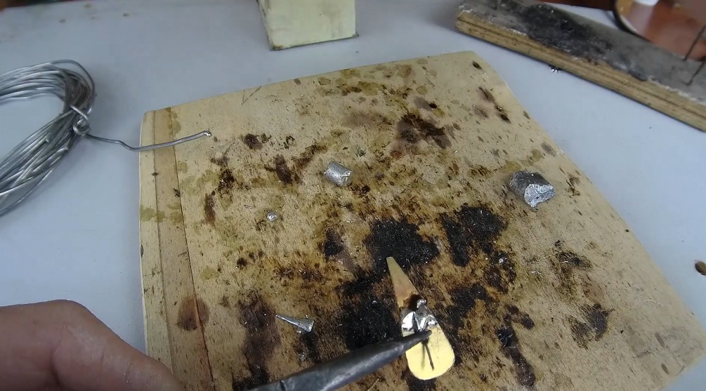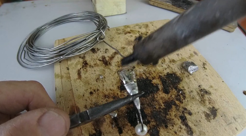Делаем небольшую петельку из проволоки, просовываем ее в отверстие будущей мормышки, разводим концы и фиксируем припоем.