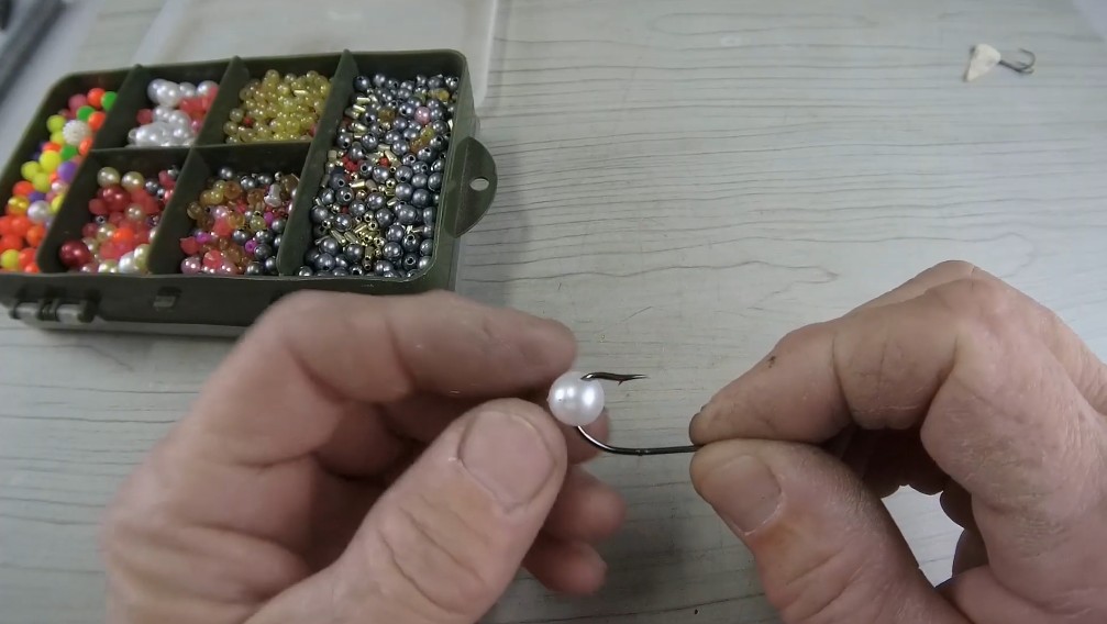 Отверстие в бусинке нужно немного просверлить, чтобы она свободно перемещалась по цевью крючка, но в то же время не могла с него соскочить.
