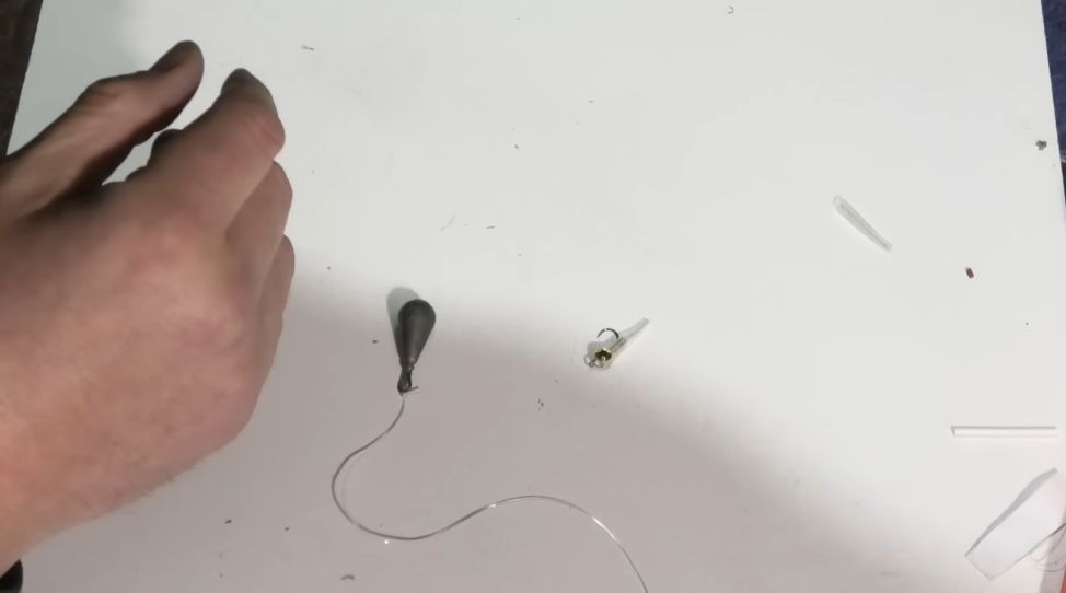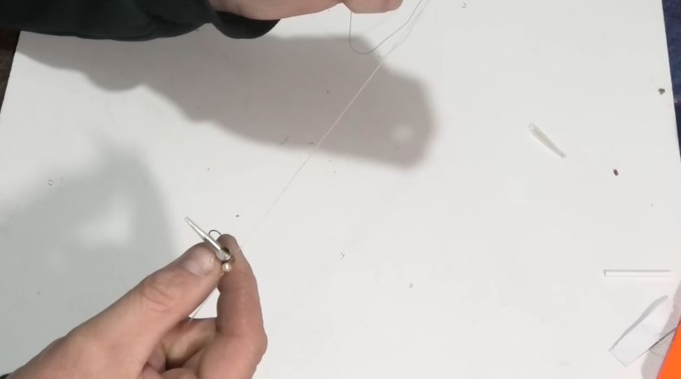 Привязали грузик, берем нашу основную леску, я использую 0,10, но вязать буду на леске толще, чтобы вам было виднее, потому что на той леске она как волосинка, на ней вообще видно ничего не будет.