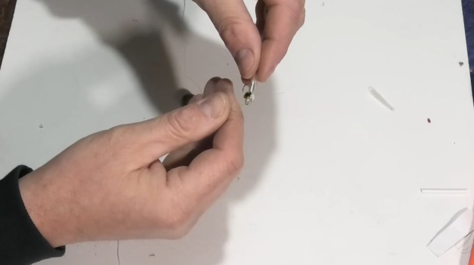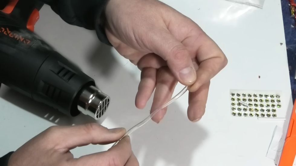 Это будет сердцевина, дальше можете взять или зажигалку и подогреть трубочку от системы, или же свечкой подогреть, но для быстроты я буду использовать строительный фен. Берем, подогреваем трубочку и начинаем легонько-легонько растягивать, чтобы у нас получилась растянутая тоненькая трубочка, аккуратненько, не спеша, этого будет достаточно.