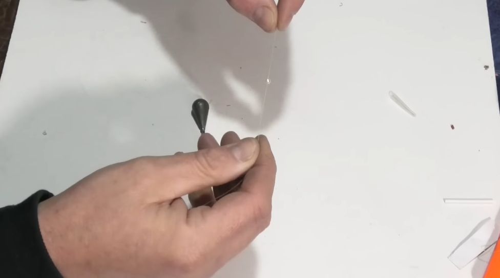 Нам понадобится буквально 50 сантиметров, берем 50 сантиметров, отрезаем, дальше грузик, главное, грузик берите, если будете ловить на течении, берите 40, и 50, и 60 грамм, но так как я буду ловить на более-менее стоячей воде, я беру грузики 20-25 грамм, этого будет достаточно, глубины у меня примерно около 3-4 метров, и привязываем любым узлом именно к этой силиконовой нити.