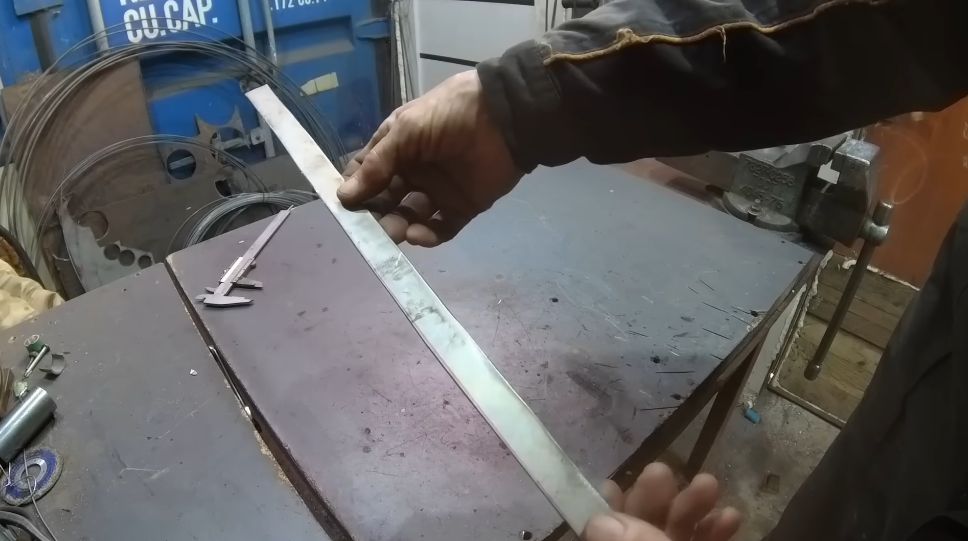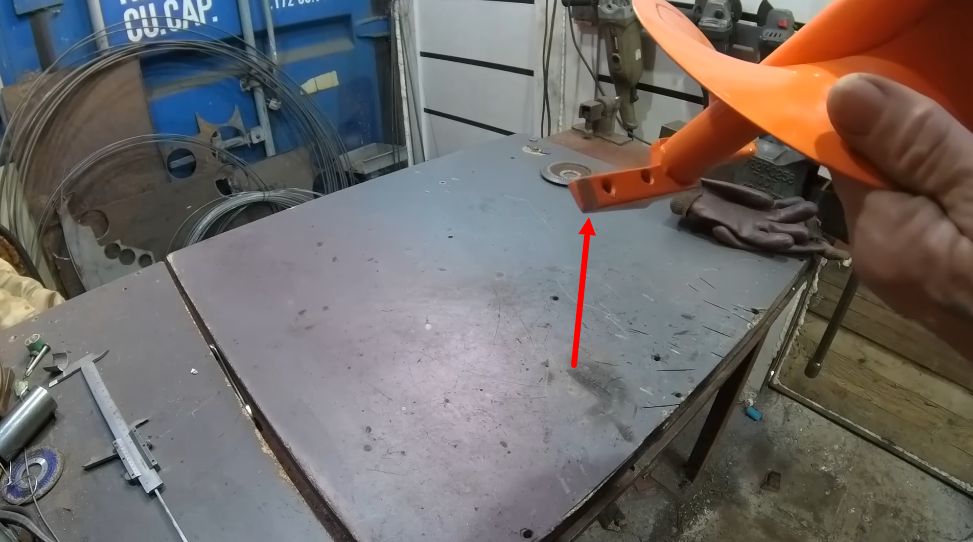 Получаем такое кольцо и провариваем стык с двух сторон. Чтобы кольцо стояло под ножами, я делаю вырез на толщину установочной площадки, здесь отступая примерно 5 мм, а со стороны лезвия 20-25.