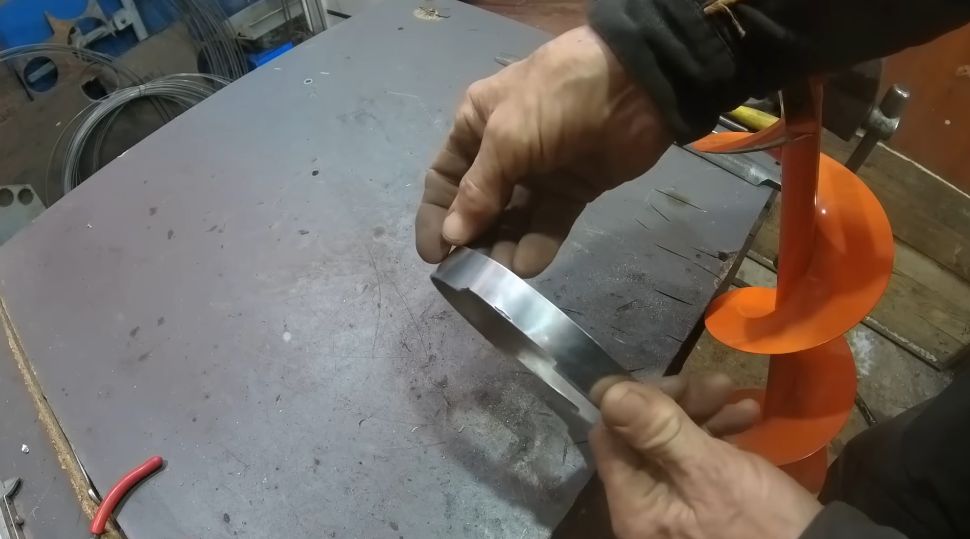 Это нержавейка, толщина 2 мм, можно брать и полтора, если нет нержавейки, вполне подойдёт чёрный металл. Сама лента шнека изготовлена из чёрного металла толщиной 1,5 мм, и ничего, работает.