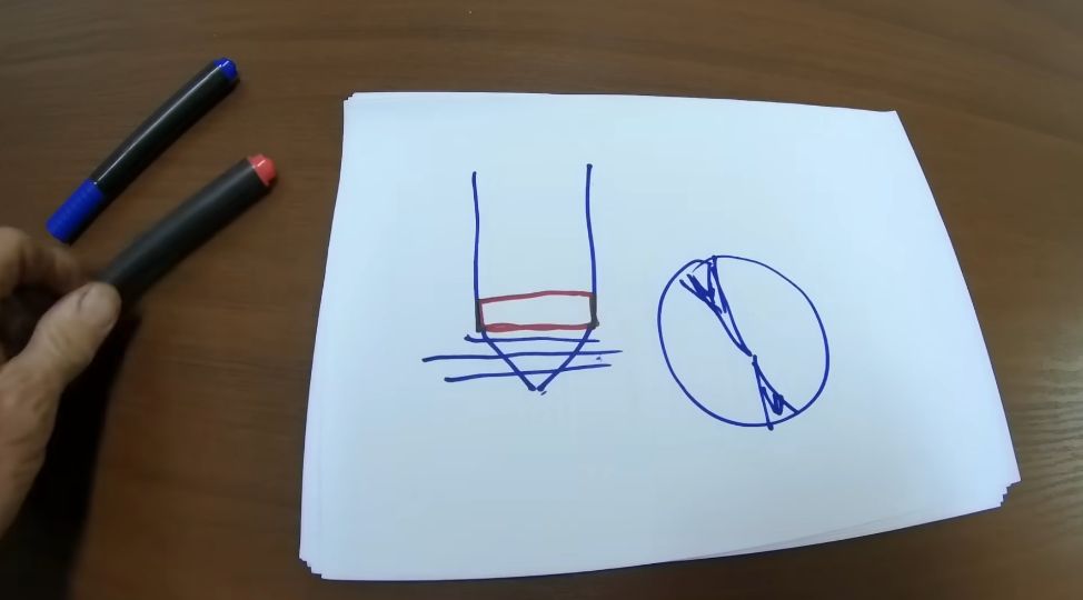 Коротко простыми словами как это работает: при бурении получается такая форма лунки, ножи не сразу прорезают всю площадь, а увеличивают её и погружаются в воду постепенно, если смотреть сверху. Как только один нож или оба ножа прорезают часть остатка льда, погружаясь в воду, происходит закусывание за кромку льда. Это в случае ручного бурения. А если стоит шуруповёрт или бензобур, ощущается небольшой удар, и шнек как по спирали затягивает в лунку.