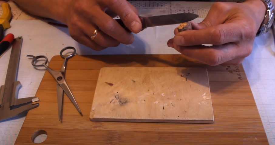 Берем медную пластинку, с одной стороны её зачищаем и выстригаем нужную нам заготовку. Размер заготовки может быть от 13 до 15 миллиметров.