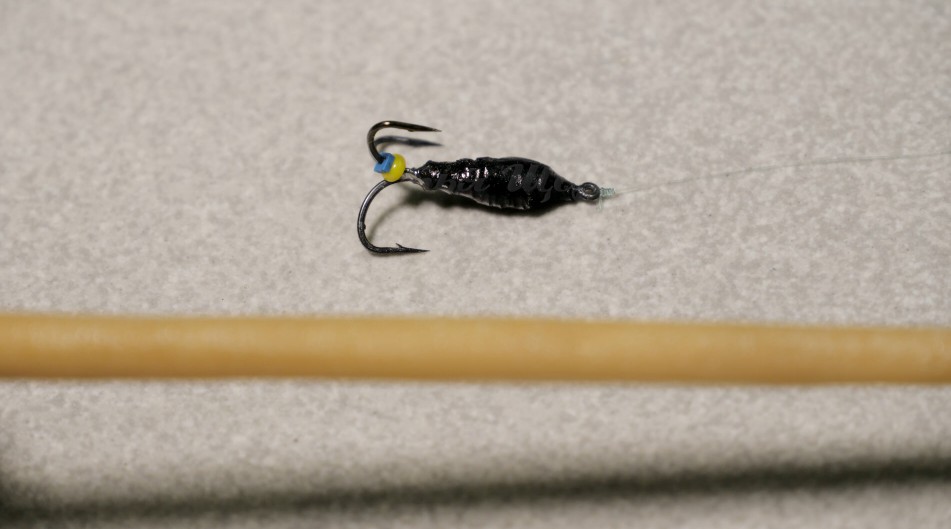 Привязываю чертика к леске диаметром 0,14 миллиметра. Кивок на удочке длинный, выгнут вверх. Именно таким кивком можно придать чертику плавную, мягкую, пилообразную.