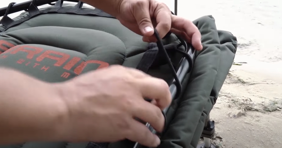 Также дам совет большим рыболовам: если вы используете кресло на протяжении всего сезона, то лучше в конце сезона его немножечко подтянуть, потому что так или иначе, резиновые стропы растягиваются, и кресло теряет свою жёсткость. Поэтому раз в сезон его нужно обязательно подтягивать.