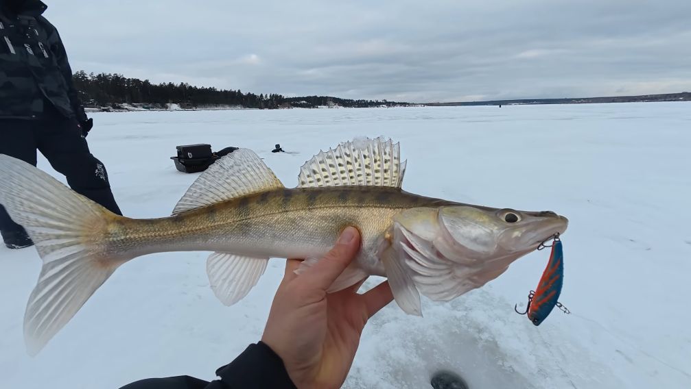 С 9 утра час дня и первая поклевка — неплохой судачок взял на лаки джоновский Виб 7, настроение поднялось до уровня, будем качать дальше, глубина 12 метров.