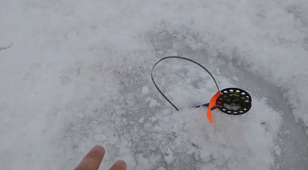 Засыпаю снегом жерлицы, чтобы не пристыло к лункам, потому что если не закидывать этой мокрой шугой, то жерлица у вас к лунке пристынет, и при подсечке вы ее сломаете либо не отдерёте ото льда.