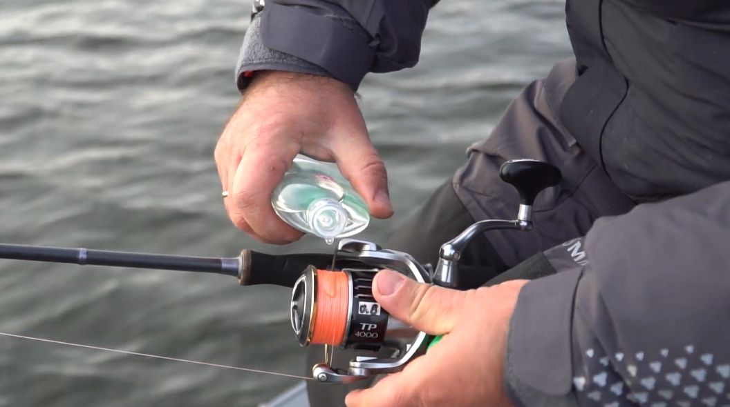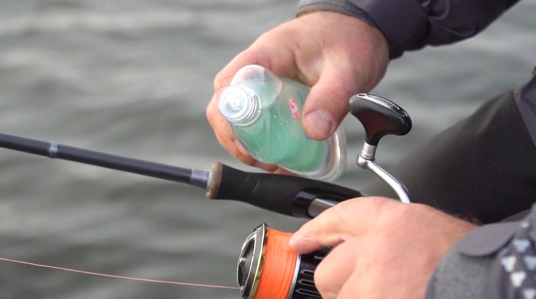 Перед началом рыбалки мы берем и немножечко наносим таким образом на наш шнур, прямо на катушке и пальцем размазываем по всей окружности.