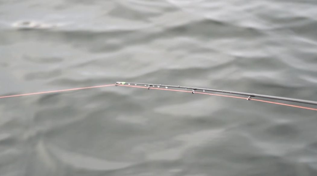 Прием очень простой, мы опускаем кончик спиннинга в воду, и как бы полощем его там,, ну и в зависимости от мороза иногда хватает на 1-2 заброса, иногда на 3, на 4, то есть не надо спиннинг бить об лодку, то есть перед забросом опустили в воду, поболтали, сделали заброс, шнур защищен, кольца чистые, можно ловить.