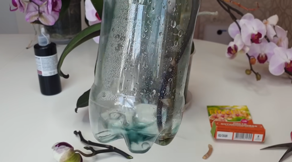 Для детки нужны очень высокие температуры, свет и достаточное количество цитокининовой пасты. Наносим пасту и помещаю в бутылку, где у меня один цветоносик уже есть, и ставлю её в углу подоконника на западном окне, где у меня очень много света. Высокая температура, высокая влажность, достаточно много цитокининовой пасты. Это все условия для того, чтобы образовалась именно детка, а не цветонос.