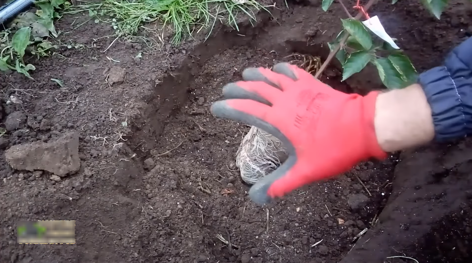 И вот важный момент посадки, значит, смотрите, в этом году, когда сажаете осенью, мы будем его укрывать, поэтому посадить желательно с небольшим наклоном, небольшой — это примерно 45 градусов по горизонтали в сторону, в ту сторону, куда вы будете его пригибать на зиму и укрывать, сажаем саженец на глубину примерно 30-40 сантиметров, как я уже сказал, с небольшим наклоном. Если бы мы сажали весной, то я бы вам посоветовал посадить вертикально, так как в летний период весенней посадки таким образом будет лучше освещаться эта верхняя часть, и ягодки на ней будут быстрее созревать, и пойдут побега замещения, которые уже нам неважно, с наклоном он посажен или прямо, всё равно следующие побеги будут укладываться на землю, а этот побег осенью срезаться будет, поэтому так как мы сажаем осенью, то, соответственно, делаем небольшой уклон, наклон для того, чтобы было легче укрыть саженец на зиму, чтобы он не поломался от нагрузки снега, который будет сверху на него ложиться зимой.