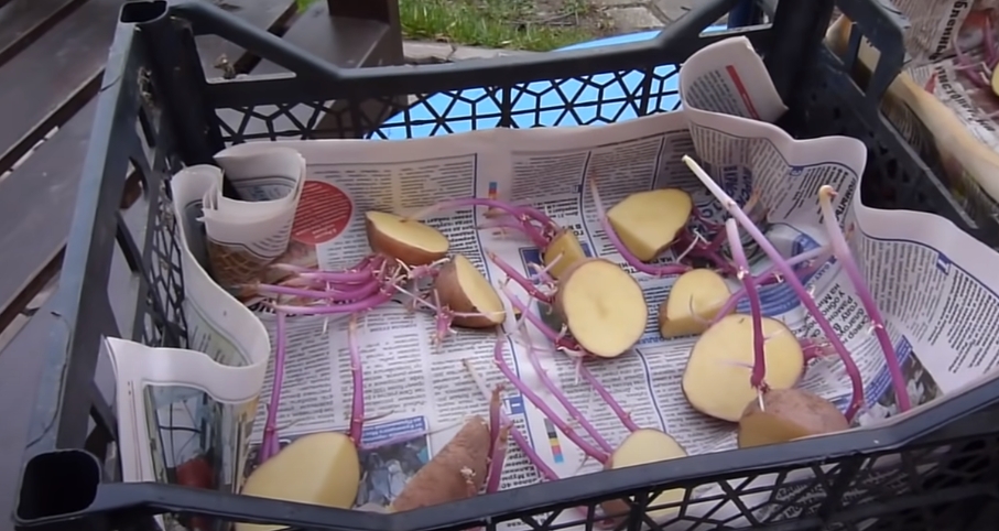 Кусочки картошки, сколько бы их не было 2 или 4, стараемся разложить на максимальном расстоянии друг от друга. Что тут важно? Если ростки такого размера, не важно, какой это сорт, главное - размер ростков и то, что они одинаковые, нет маленьких и больших.
