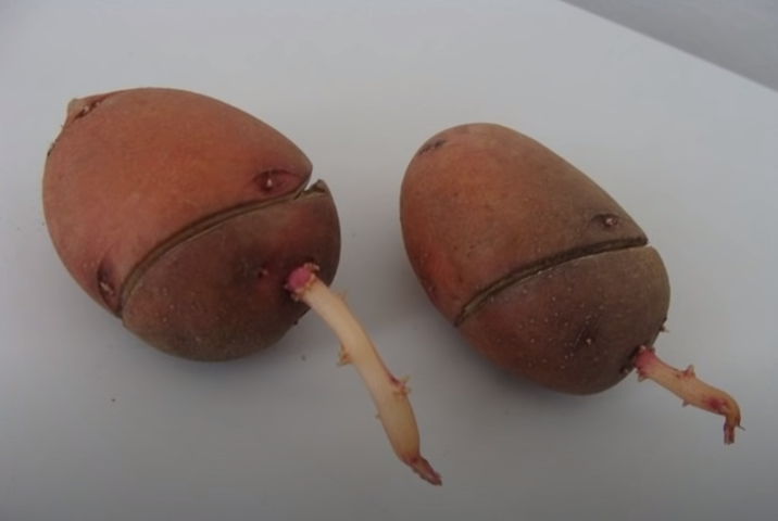 Ростки появляются и на пуповинной части, но это запасные ростки. Они развиваются до определенного момента и прекращают развитие. Даже перемычка, не прорезанная серединка клубня с диаметром 5 миллиметров позволяет клубню чувствовать, что он целый, а значит, и развивать запасные ростки не нужно. Это опыты Олега Александровича Телепова.