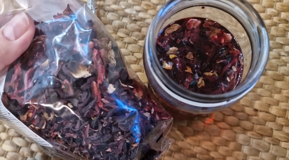 Итак, на небольшую баночку или стакан горячей воды я беру одну чайную ложку каркадэ. Я прям такие большие пачки покупаю каркадэ в местном магазине, стоит копейки, рублей 20, мне хватает надолго, несмотря на то что я этот напиток пью каждый день.
