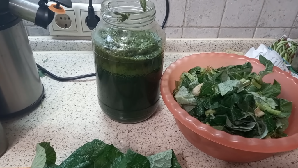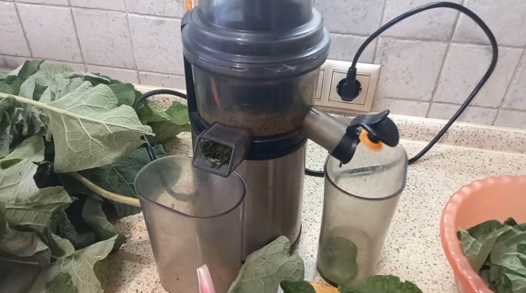 Еще раз хочу сказать, что лист лопуха является ценнейшим растением для человеческого организма, не только лист, но и корни. На данном этапе я сейчас буду через соковыжималку отжимать сок. Соковыжималка это специальная для растений, то есть не центрифужная, как для фруктов, а шнековая, то есть она имеет такую особенность, что она медленно вращается и давит сок из листьев. У кого есть какие проблемы со здоровьем, сделайте себе этот сок.