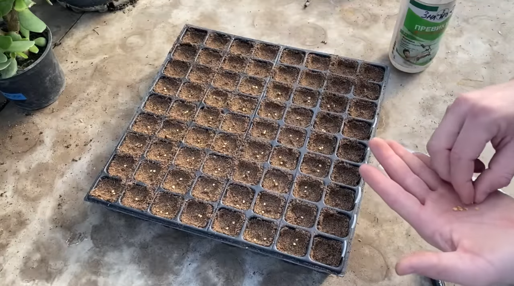 После посева семян я присыпаю их тем же грунтом «Агробалт», который уже сам по себе имеет умеренную влажность. Кроме того, после того как я накрываю семена слоем торфа, я поливаю их смесью «Превиркур» так же, как и томаты. Для этого я смешиваю 3 мл препарата на 2 л воды комнатной температуры и поливаю сверху каждую ячейку. У меня уходит примерно 1 литр такой смеси на одну кассету.