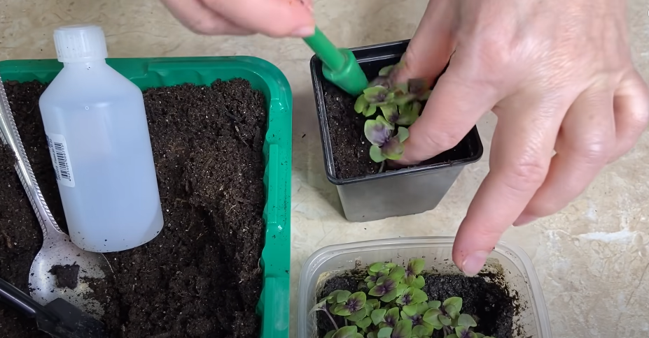 Можно при необходимости подсыпать еще немножко грунта, если ножки вытянулись. То есть можно заглубить растение при необходимости. Базилик это прекрасно переносит. И немножечко поливаем. Если у вас несколько сортов, то обязательно ставьте бирочку с названием сорта.