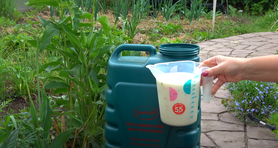 В опрыскиватель объемный я налила 9 литров воды. Воду лучше брать не хлорированную, а если это будет дождевая вода, то это будет еще лучше. Сюда я добавлю 1 литр молока. Жирность молока не имеет особого значения.