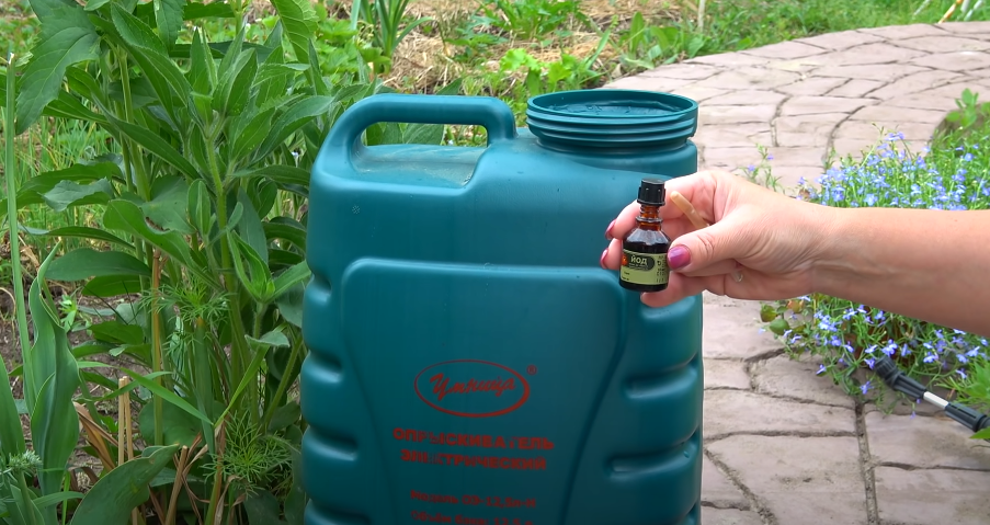 И последний компонент - это йод. Я использую спиртовой раствор йода, который продается в аптеке. На 10 литров рабочего раствора нам понадобится 10 капель йода.
