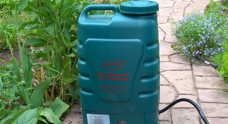 А теперь приступим к опрыскиванию. Опрыскивать я растение буду с помощью аккумуляторного опрыскивателя. Это очень удобно, и это повышает производительность труда не 5, а в 25 раз. Зарядки аккумулятора хватает на 6 часов. То есть один раз зарядили аккумулятор и можно 6 часов работать. Это очень-очень удобно. Емкость позволяет делать раствор от 1 литра и до 12, 5. Это именно у данной модели он сделан в виде ранца. Его можно одеть на спину, можно поставить между грядками и опрыскивать, так как длина провода и длину опрыскивателя позволяет опрыскивать достаточно большую площадь. Но при желании можно купить дополнительно телескопическую удочку, и ее длина увеличится до 2 метров 30 сантиметров. Также в комплекте есть всевозможные насадки, которые можно менять и делать всевозможные обработки опрыскивания как деревьев, так и кустарников. И самое важное, что гарантия производителя на этот опрыскиватель - один год, что тоже немаловажно.