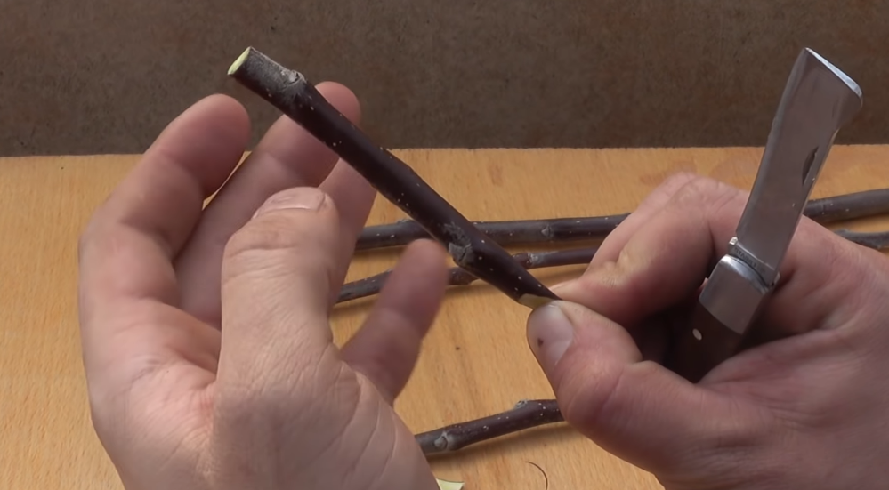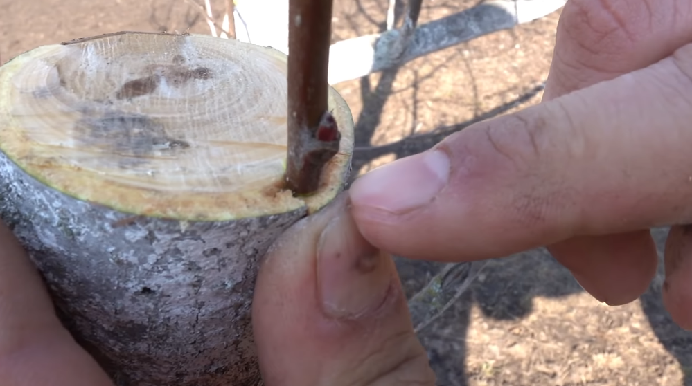 За счет этого острия ваша ветка будет держаться, так она залезет под кору, за счет этого будет держаться, ни ветер, ни птичка ее не сможет отломать. Очень часто бывает, что один год приживается, вроде все нормально, следующий год — она просто отваливается, вот за счет этого среза будет хорошо держаться.