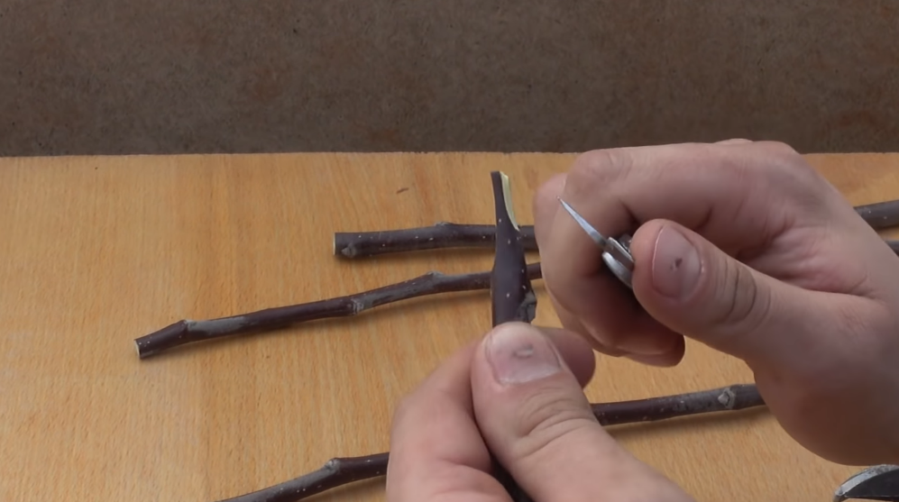 Сейчас мы берем прививочный нож и аккуратно очищаем вокруг спила.
