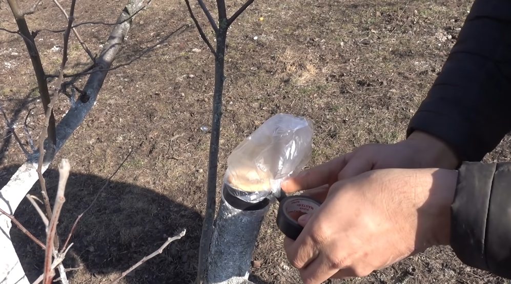 Далее мы сейчас обматываем изолентой и какой-либо пакетик цепляем сверху, когда наматываете изоленту, обязательно первые обороты не липкой стороной, чтобы потом не сорвать кору.