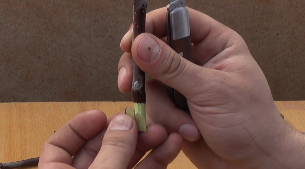 Далее самое главное, ниже почки вот эту часть мы срезаем кору, и тут нужен очень острый нож, это должен быть или прививочный, или канцелярский, и срезаем такими очень легкими движениями, нам нужно дорезать до камбия, и ни в коем случае его не снять, живые зеленые клетки, вот за счет них идет прорастание.