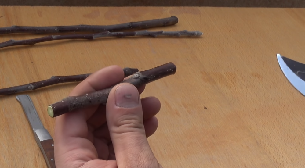 Далее заготавливаем черенки на 3 почки, у этой части должна быть хорошая длина, чтобы у нас получилось остриё, которое мы загоним под кору. Считаем 3 почки и делаем срез. Вот это у нас идеальный черенок для прививки.
